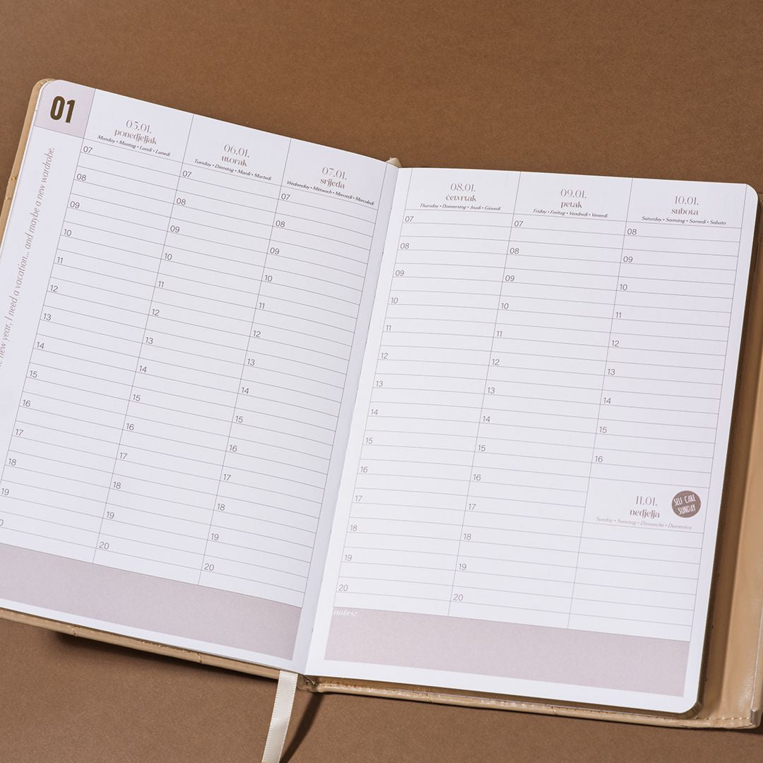 Avec son look nude luxueux et irrésistible, ses détails dorés et son intérieur soigneusement conçu, l'agenda JN devient votre guide personnel pour une journée organisée, inspirée et élégante. 🎀