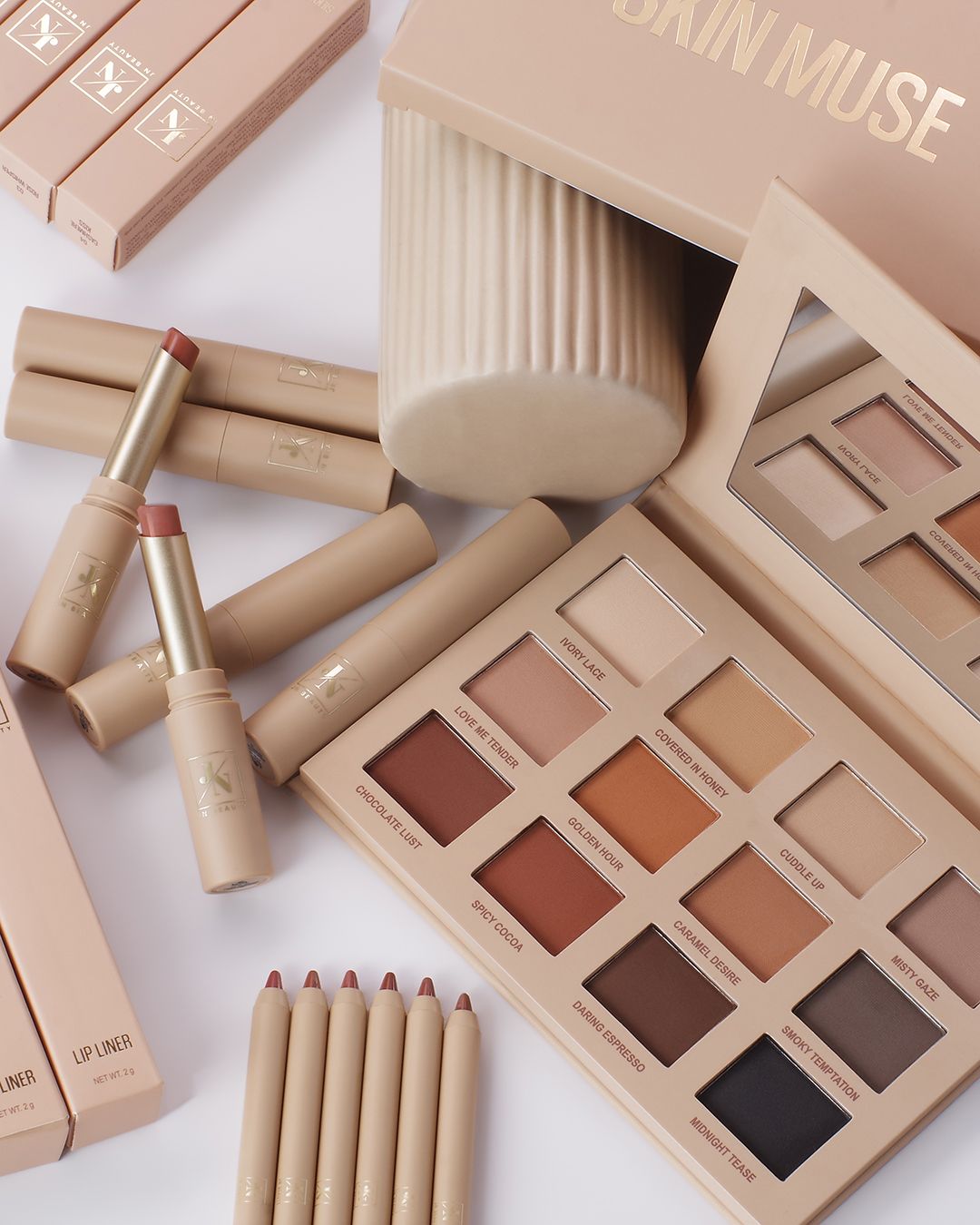 Découvrez la collection de maquillage nude SKIN MUSE - JN Beauty🔥 - une fusion de formules innovantes, de minimalisme et de design haute couture. Une palette de fards à paupières avec 12 teintes, six rouges à lèvres mats soyeux et six crayons à lèvres parfaitement précis apportent le look nude ultime dans des tons chauds, sableux et profonds.🤎